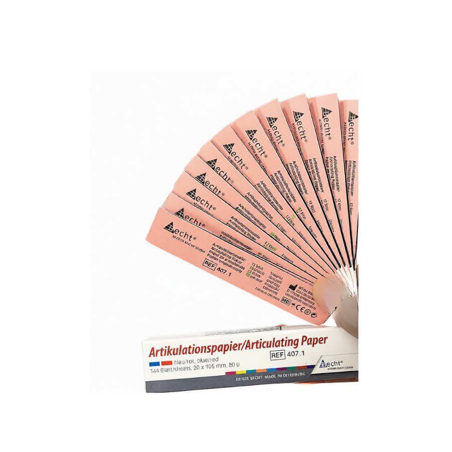 - Giấy cắn nha khoa là dụng cụ hỗ trợ trong quá trình khám và điều chỉnh khớp cắn, giúp ghi lại dấu răng rõ ràng và chính xác. Sản phẩm được thiết kế mềm mịn, độ dai cao, kháng rách, mang lại sự tiện lợi và hiệu quả cho bác sĩ trong quá trình kiểm tra và điều chỉnh.