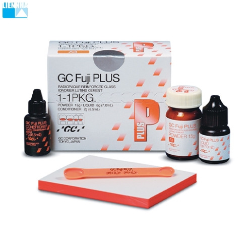 - Fuji Plus 1-1 PKG là xi măng Glass Ionomer gia cố nhựa (Resin-reinforced) cao cấp từ GC (Nhật Bản), chuyên dùng gắn vĩnh viễn mão/cầu sứ, kim loại, inlay/onlay. Sản phẩm nổi bật với lực dán mạnh, giải phóng Fluoride, dễ thao tác và độ mỏng tối ưu.